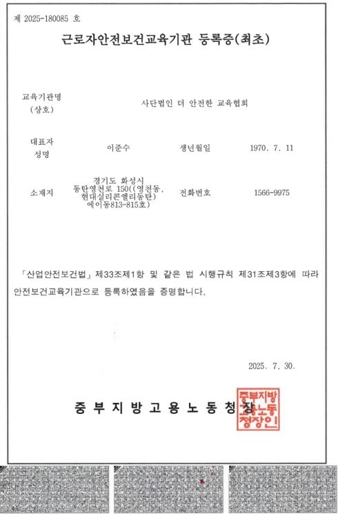 첨부파일 1 : 근로자안전보건교육기관 등록증_더안전한교육협회.pdf
